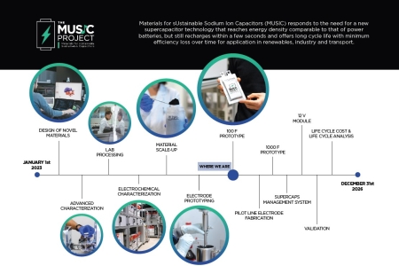 The updated MUSIC project trifold provides an overview of the project’s objectives, consortium, and technological roadmap, while reflecting the progress achieved to date. It highlights where MUSIC currently stands along the development pathway — from novel materials and advanced characterisation to electrode prototyping and module-level validation — and illustrates how the project is advancing towards sustainable, high-performance sodium-ion capacitors for energy, industry, and transport applications.